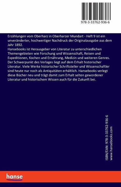 Erzählungen vom Oberharz in Oberharzer Mundart - Heft 9 ist ein unveränderter, hochwertiger Nachdruck der Originalausgabe aus dem Jahr 1892.Hansebooks ist Herausgeber von Literatur zu unterschiedlichen Themengebieten wie Forschung und Wissenschaft, Reisen und Expeditionen, Kochen und Ernährung, Medizin und weiteren Genres. Der Schwerpunkt des Verlages liegt auf dem Erhalt historischer Literatur. Viele Werke historischer Schriftsteller und Wissenschaftler sind heute nur noch als Antiquitäten erhältlich. Hansebooks verlegt diese Bücher neu und trägt damit zum Erhalt selten gewordener Literatur und historischem Wissen auch für die Zukunft bei.