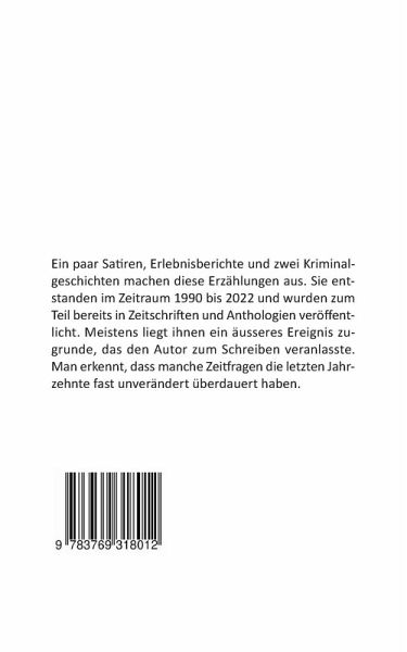 Ein paar Satiren, Erlebnisberichte und zwei Kriminalgeschichten machen diese Erzählungen aus. Sie entstanden im Zeitraum 1990 bis 2022 und wurden zum Teil bereits in Zeitschriften und Anthologien veröffentlicht. Meistens liegt ihnen ein äusseres Ereignis zugrunde, das den Autor zum Schreiben veranlasste. Man erkennt, dass manche Zeitfragen die letzten Jahrzehnte fast unverändert überdauert haben.