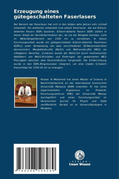 Der Bereich der Faserlaser hat sich in den letzten zehn Jahren sehr schnell entwickelt. Am weitesten entwickelt sind jedoch Faserlaser, die auf Erbium-dotierten Fasern (EDF) basieren. Erbium-dotierte Fasern (EDF) stellen in dieser Arbeit ein Verstärkermedium dar, da sie die Fähigkeit besitzen, Licht im Wellenlängenbereich von 1550 nm zu verstärken. In dieser Forschungsarbeit wurde ein gütegeschalteter Erbium-dotierter Faserlaser (EDFLs) unter Verwendung von zwei verschiedenen 2D-Nanomaterialien demonstriert: Molybdändisulfid (MoS2) und Wolframdisulfid (WS2) als sättigbarer Absorber. Zunächst wurde der MoS2-SA durch mechanisches Abblättern von MoS2-Kristallen und Einbringen der gewonnenen WS2-Flüssigkeit zwischen zwei Faserendhülsen hergestellt. Die SA-Vorrichtung wurde in den EDFL-Ringresonator integriert, um eine stabile Q-Switch-Impulsfolge bei 1559,16 nm zu erzeugen.