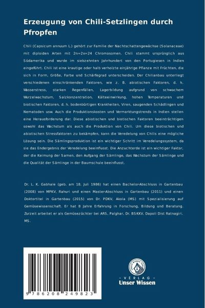 Chili (Capsicum annuum L.) gehört zur Familie der Nachtschattengewächse (Solanaceae) mit diploiden Arten mit 2n=2x=24 Chromosomen. Chili stammt ursprünglich aus Südamerika und wurde im siebzehnten Jahrhundert von den Portugiesen in Indien eingeführt. Chili ist eine krautige oder halb verholzte einjährige Pflanze mit Früchten, die sich in Form, Größe, Farbe und Schärfegrad unterscheiden. Der Chilianbau unterliegt verschiedenen einschränkenden Faktoren, wie z. B. abiotischen Faktoren, d. h. Wasserstress, starken Regenfällen, Lagerbildung aufgrund von schwachem Wurzelwachstum, Salzkonzentration, Kälteeinwirkung, hohen Temperaturen und biotischen Faktoren, d. h. bodenbürtigen Krankheiten, Viren, saugenden Schädlingen und Nematoden usw. Auch die Produktionskosten und Vermarktungstrends in Indien stellen eine Herausforderung dar. Diese abiotischen und biotischen Faktoren beeinträchtigen sowohl das Wachstum als auch die Produktion von Chili. Um diese biotischen und abiotischen Stressfaktoren zu bekämpfen, kann die Veredelung von Chilis eine mögliche Lösung sein. Die Sämlingsproduktion ist ein wichtiger Schritt im Veredelungssystem, da sie das Endergebnis der Veredelung beeinflusst. Die Anzuchterde ist ein wichtiger Faktor, der die Keimung der Samen, den Aufgang der Sämlinge, das Wachstum der Sämlinge und die Qualität der Sämlinge in der Baumschule beeinflusst.