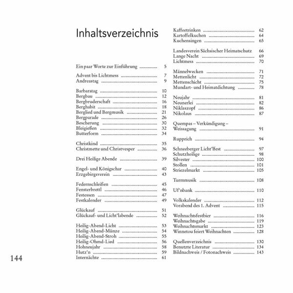 Advent bis Lichtmess · Andreastag · Barbaratag · Bergbau · Bergbruderschaft · Berghabit · Berglied und Bergmusik · Bergparade · Bescherung · Bleigießen · Butterform · Christkind · Christmette und Christvesper · Drei Heilige Abende · Engel- und Königschar · Erzgebirgsverein · Federnschleißen · Fensterbrettl · Festessen · Festkalender · Glückauf · Glückauf- und Licht'labende · Heilig-Abend-Licht · Heilig-Abend-Münze · Heilig-Abend-Stroh · Heilig-Ohmd-Lied · Hohneujahr · Hutz'n · Internächte · Kaffeetrinken · Kartoffelkuchen · Kuchensingen · Landesverein Sächsischer Heimatschutz · Lange Nacht · Lichtmess · Männelwecken · Mettenlicht · Mettenschicht · Mundart- und Heimatdichtung · Neujahr · Neunerlei · Niklaszopf · Nikolaus · Quempas - Verkündigung - Weissagung · Rupprich · Schneeberger Licht'lfest · Schutzheilige · Silvester · Stollen · Striezelmarkt · Turmmusik · Uf'nbank · Volkskalender · Vorabend des 1. Advent · Weihnachtsfestbier · Weihnachtsgabe · Weihnachtsmarkt · Winnetou feiert Weihnachten