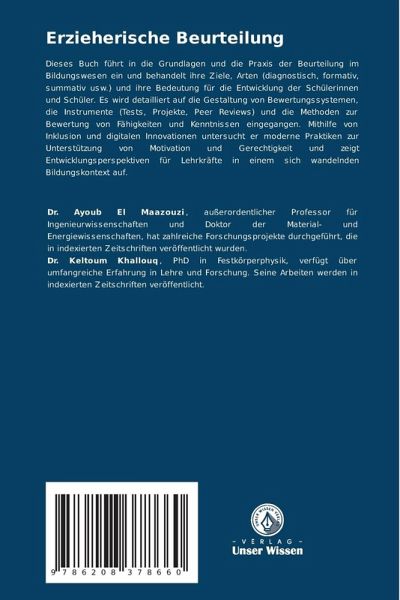 Dieses Buch führt in die Grundlagen und die Praxis der Beurteilung im Bildungswesen ein und behandelt ihre Ziele, Arten (diagnostisch, formativ, summativ usw.) und ihre Bedeutung für die Entwicklung der Schülerinnen und Schüler. Es wird detailliert auf die Gestaltung von Bewertungssystemen, die Instrumente (Tests, Projekte, Peer Reviews) und die Methoden zur Bewertung von Fähigkeiten und Kenntnissen eingegangen. Mithilfe von Inklusion und digitalen Innovationen untersucht er moderne Praktiken zur Unterstützung von Motivation und Gerechtigkeit und zeigt Entwicklungsperspektiven für Lehrkräfte in einem sich wandelnden Bildungskontext auf.