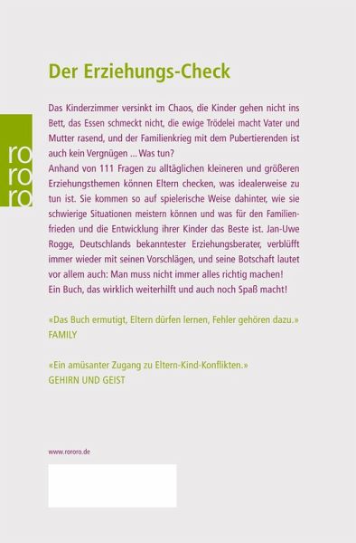 Der Erziehungs-CheckDas Kinderzimmer versinkt im Chaos, die Kinder gehen nicht ins Bett, das Essen schmeckt nicht, die ewige Trödelei macht Vater und Mutter rasend, und der Familienkrieg mit dem Pubertierenden ist auch kein Vergnügen ... Was tun?Anhand von 111 Fragen zu alltäglichen kleineren und größeren Erziehungsthemen können Eltern checken, was idealerweise zu tun ist. Sie kommen so auf spielerische Weise dahinter, wie sie schwierige Situationen meistern können und was für den Familienfrieden und die Entwicklung ihrer Kinder das Beste ist. Jan-Uwe Rogge, Deutschlands bekanntester Erziehungsberater, verblüfft immer wieder mit seinen Vorschlägen, und seine Botschaft lautet vor allem auch: Man muss nicht immer alles richtig machen!Ein Buch, das wirklich weiterhilft und auch noch Spaß macht!«Das Buch ermutigt, Eltern dürfen lernen, Fehler gehören dazu.» Family«Ein amüsanter Zugang zu Eltern-Kind-Konflikten.» Gehirn und Geist