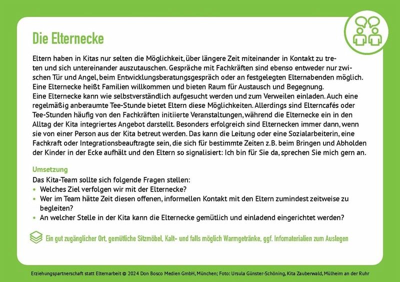 Vertrauen schaffen, von Anfang an: Das bedeutet heutzutage mehr, als gelegentlich ein Elterngespräch zu führen. Wenn Mütter und Väter ihre Kinder mit einem guten Gefühl in die Kita bringen, ist das Bedürfnis nach Transparenz und direkten Einblicken in deren Alltag groß. Auch pädagogische Fachkräfte sind für ihre tägliche Arbeit auf einen guten Kontakt zu den Familien angewiesen, deren Lebensformen und kulturellen Hintergründe immer vielfältiger werden. Mit diesem Impulskarten-Set erhalten Erzieher:innen ein aktuelles Update zu neuesten Entwicklungen und Methoden im Bereich der Elternarbeit.