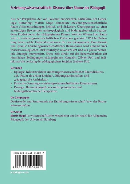 Aus der Perspektive der von Foucault entwickelten Kritikform der Genealogie hinterfragt Martin Nugel elementare erziehungswissenschaftliche Raum-/Wissensordnungen kritisch und diskutiert Überlegungen zu einer zukünftigen Bewusstheit anthropologisch und bildungstheoretisch begründeter Produktionen des pädagogischen Raums. Welches Wissen über Raum wird in erziehungswissenschaftlichen Diskursen generiert? Welche Bedeutung haben solche Diskursformationen für eine pädagogische Raumtheorie und -praxis? Erziehungswissenschaftliches Raumwissen wird anhand einer wissenssoziologischen Diskursanalyse rekonstruiert und als gouvernementale Strategie interpretiert. Diese zielt direkt auf die Beherrschbarkeit der räumlichen Bedingungen pädagogischen Handelns (Objekt-Pol) und indirekt auf die Lenkung der pädagogischen Subjekte (Subjekt-Pol).