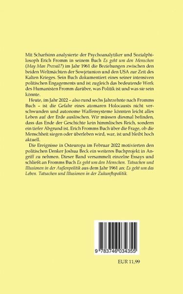 Mit Scharfsinn analysierte der Psychoanalytiker und Sozialphilosoph Erich Fromm in seinem Buch Es geht um den Menschen (May Man Prevail?) im Jahr 1961 die Beziehungen zwischen den beiden Weltmächten der Sowjetunion und den USA zur Zeit des Kalten Krieges. Sein Buch dokumentiert eines seiner intensiven politischen Engagements und ist zugleich das bedeutende Werk des Humanisten Fromm darüber, was Politik ist und was sie sein könnte.Heute, im Jahr 2022 - also rund sechs Jahrzehnte nach Fromms Buch - ist die Gefahr eines atomaren Holocausts nicht verschwunden und autonome Waffensysteme könnten leicht alles Leben auf der Erde auslöschen. Wir müssen diesmal befinden, dass das Ende der Geschichte kein himmlisches Reich, sondern ein tiefer Abgrund ist. Erich Fromms Buch über die Frage, ob die Menschheit siegen oder überleben wird, war, ist und bleibt hoch aktuell.Die Ereignisse in Osteuropa im Februar 2022 motivierten den politischen Denker Joshua Beck ein weiteres Buchprojekt in Angriffzu nehmen. Dieser Band versammelt einzelne Essays und schließt an Fromms Buch Es geht um den Menschen. Tatsachen und Illusionen in der Außenpolitik aus dem Jahr 1961 an: Es geht um das Leben. Tatsachen und Illusionen in der Zukunftspolitik.