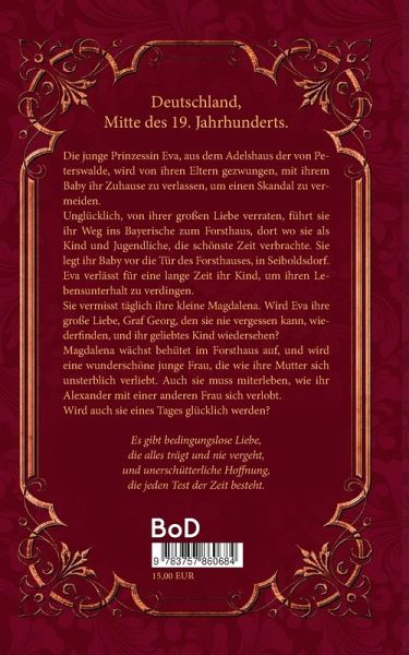 Deutschland, Mitte des 19. Jahrhunderts.Die junge Prinzessin Eva, aus dem Adelshaus der von Peterswalde,wird von ihren Eltern gezwungen, mit ihrem Baby ihr Zuhause zu verlassen, um einen Skandal zu vermeiden.Unglücklich, von ihrer großen Liebe verraten, führt sie ihr Weg ins Bayerische zum Forsthaus, dort wo sie als Kind und Jugendliche, die schönste Zeit verbrachte. Sie legt ihr Baby vor die Tür des Forsthauses, in Seiboldsdorf. Eva verlässt für eine lange Zeit ihr Kind, um ihren Lebensunterhalt zu verdingen.Sie vermisst täglich ihre kleine Magdalena. Wird Eva ihre große Liebe, Graf Georg, den sie nie vergessen kann, wiederfinden, und ihr geliebtes Kind wiedersehen?Magdalena wächst behütet im Forsthaus auf, und wird eine wunderschönejunge Frau, die wie ihre Mutter sich unsterblich verliebt. Auch sie muss miterleben, wie ihr Alexander mit einer anderen Frau sich verlobt.Wird auch sie eines Tages glücklich werden?Es gibt bedingungslose Liebe, die alles trägt und nie vergeht, und unerschütterliche Hoffnung, die jeden Test der Zeit besteht.