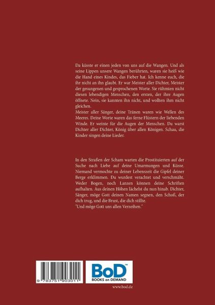 Da küsste er einen jeden von uns auf die Wangen. Und als seine Lippen unsere Wangen berührten, waren sie heiß wie die Hand eines Kindes, das Fieber hat. Ich kenne euch, die ihr nicht an ihn glaubt. Er war Meister aller Dichter, Meister der gesungenen und gesprochenen Worte. Sie rühmten nicht diesen lebendigen Menschen, den ersten, der ihre Augen öffnete. Nein, sie kannten ihn nicht, und wollten ihm nicht gleichen. Meister aller Sänger, deine Tränen waren wie Mellen des Meeres. Deine Worte waren das ferne Flüstern der liebenden Winde. Er weinte für die Augen der Menschen. Du warst Dichter aller Dichter, König über allen Königen. Schau, die Kinder singen deine Lieder. In den Straßen der Scham warten die Prostituierten auf der Suche nach Liebe auf deine Umarmungen und Küsse. Niemand vermochte zu deiner Lebenszeit die Gipfel deiner Berge erklimmen. Du wurdest verachtet und verschmäht. Dein Stift war scharf wie das Schwert eines Ritters. Weder Bogen, noch Lanzen können deine Schriften aufhalten. Aus deinen Höhen lächelst du nun hinab. Dichter, Sänger, unermessliches Herz, möge Gott deinen Namen segnen, den Schoß, der dich trug und die Brust, die dich stillte. "Und Möge Gott uns allen Verzeihen."