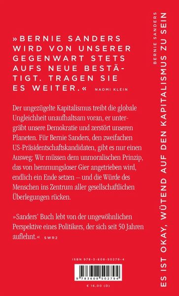 Wie können wir ein Wirtschaftssystem akzeptieren, das die Reichen immer reicher und die Armen immer ärmer macht? Wie können wir ein politisches System akzeptieren, das es den Superreichen erlaubt, Wahlen und Politiker zu kaufen? Wie können wir ein Energiesystem akzeptieren, von dem die Konzerne profitieren, die die Klimakrise verursachen? Laut Bernie Sanders haben wir Grund genug, wütend auf den Kapitalismus zu sein. Mehr noch: Unsere Wut ist der erste Schritt in eine neue Zukunft. Wir müssen anerkennen, dass wirtschaftliche Rechte Menschenrechte sind, und eine Gesellschaft schaffen, die einen angemessenen Lebensstandard für alle bietet. Denn wie schon Franklin D. Roosevelt sagte: »Echte individuelle Freiheit kann es ohne wirtschaftliche Absicherung und Unabhängigkeit nicht geben.«