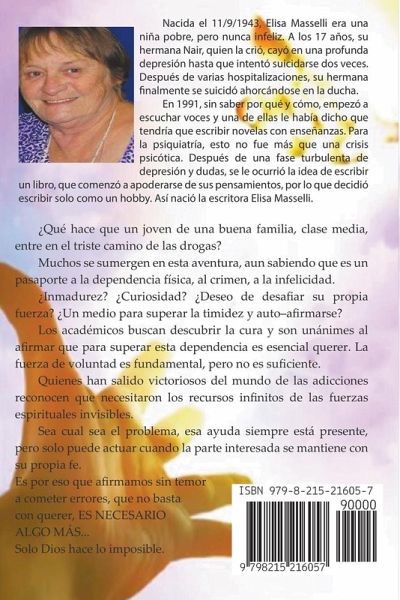 "¿Qué hace que un joven de una buena familia, clase media, entre en el triste camino de las drogas? Muchos se sumergen en esta aventura, aun sabiendo que es un pasaporte a la dependencia física, al crimen, a la infelicidad. ¿Inmadurez? ¿Curiosidad? ¿Deseo de desafiar su propia fuerza? ¿Un medio para superar la timidez y auto-afirmarse? Los académicos buscan descubrir la cura y son unánimes al afirmar que para superar esta dependencia es esencial querer. La fuerza de voluntad es fundamental, pero no es suficiente. Quienes han salido victoriosos del mundo de las adicciones reconocen que necesitaron los recursos infinitos de las fuerzas espirituales invisibles. Sea cual sea el problema, esa ayuda siempre está presente, pero solo puede actuar cuando la parte interesada se mantiene con su propia fe. Es por eso que afirmamos sin temor a cometer errores, que no basta con querer, ES NECESARIO ALGO MÁS... Solo Dios hace lo imposible." ZIBIA GASPARETTO