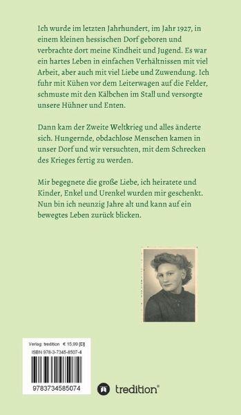 Ich wurde im letzten Jahrhundert, 1927, in einem kleinen hessischen Dorf geboren und verbrachte dort meine Kindheit und Jugend. Es war ein hartes Leben in einfachen Verhältnissen mit viel Arbeit, aber auch mit viel Liebe und Zuwendung. Ich fuhr mit Kühen vor dem Leiterwagen auf die Felder, schmuste mit den Kälbchen im Stall und versorgte unsere Hühner und Enten. Dann kam der Zweite Weltkrieg und alles änderte sich. Hungernde, obdachlose Menschen kamen in unser Dorf und wir versuchten, mit dem Schrecken des Krieges fertig zu werden. In neunzig Jahren gelebten Lebens begegnete mir die große Liebe, ich heiratete, Kinder, Enkel und Urenkel wurden mir geschenkt und viele Erlebnisse, an die ich mich gerne erinnere.