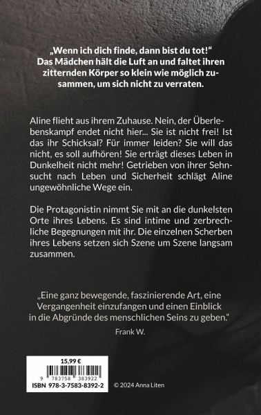 Aline flieht aus ihrem Zuhause. Nein, der Überlebenskampf endet nicht hier ... Sie ist nicht frei! Ist das ihr Schicksal? Für immer leiden? Sie will das nicht, es soll aufhören! Sie erträgt dieses Leben in Dunkelheit nicht mehr! Getrieben von ihrer Sehnsucht nach Leben, Liebe und Sicherheit schlägt Aline ungewöhnliche Wege ein.Die Protagonistin nimmt Sie mit an die dunkelsten Orte ihres Lebens. Es sind intime und zerbrechliche Begegnungen mit ihr. Die einzelnen Scherben ihres Lebens setzen sich Szene um Szene langsam zusammen.