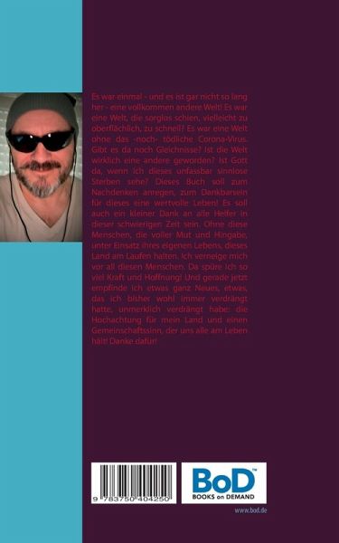 Es war einmal - und es ist gar nicht so lang her - eine vollkommen andere Welt! Es war eine Welt, die sorglos schien, vielleicht zu oberflächlich, zu schnell? Es war eine Welt ohne das -noch- tödliche Corona-Virus. Gibt es da noch Gleichnisse? Ist die Welt eine andere geworden? Ist Gott da, wenn ich dieses unfassbar sinnlose Sterben sehe? Dieses Buch soll zum Nachdenken anregen, zum Dankbarsein für dieses eine wertvolle Leben! Es soll auch ein kleiner Dank an alle Helfer in dieser schwierigen Zeit sein. Ohne diese Menschen, die voller Mut und Hingabe, unter Einsatz ihres eigenen Lebens, dieses Land am Laufen halten. Ich verneige mich vor all diesen Menschen. Da spüre ich so viel Kraft und Hoffnung! Und gerade jetzt empfinde ich etwas ganz Neues, etwas, das ich bisher wohl immer verdrängt hatte, unmerklich verdrängt habe: die Hochachtung für mein Land und einen Gemeinschaftssinn, der uns alle am Leben hält! Danke dafür!