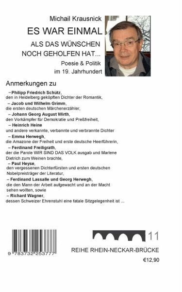 ES WAR EINMALALS DAS WÜNSCHENNOCH GEHOLFEN HAT...Poesie & Politikim 19. JahrhundertAnmerkungen zu- Philipp Friedrich Schütz,den in Heidelberg geköpften Dichter der Romantik,- Jacob und Wilhelm Grimm,die ersten deutschen Märchenerzähler,- Johann Georg August Wirth,den Vorkämpfer für Demokratie und Preßfreiheit,- Heinrich Heineund andere verkannte, verbannte und verbrannte Dichter- Emma Herwegh,die Amazone der Freiheit und erste deutsche Heerführerin,- Ferdinand Freiligrath,der die Parole WIR SIND DAS VOLK ausgab und MarleneDietrich zum Weinen brachte,- P aul Heyse,den vergessenen Dichterfürsten und ersten deutschenNobelpreisträger der Literatur,- Ferdinand Lassalle und Georg Herwegh,die den Mann der Arbeit aufgewacht und an der Machtsehen wollten, sowie- Richard Wagner,dessen Schweizer Ehrenstuhl eine fatale Sitzgelegenheit ist .