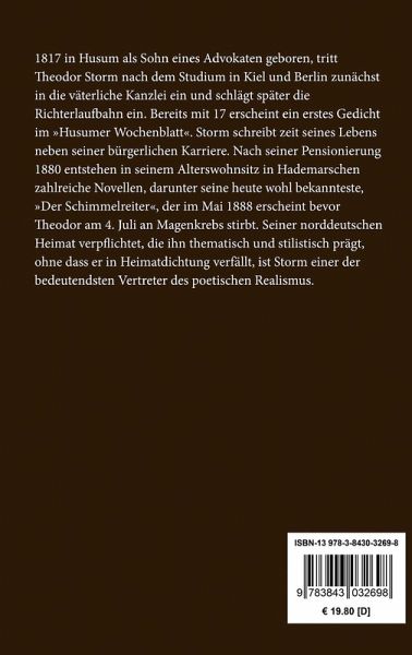 1817 in Husum als Sohn eines Advokaten geboren, tritt Theodor Storm nach dem Studium in Kiel und Berlin zunächst in die väterliche Kanzlei ein und schlägt später die Richterlaufbahn ein. Bereits mit 17 erscheint ein erstes Gedicht im "Husumer Wochenblatt". Storm schreibt zeit seines Lebens neben seiner bürgerlichen Karriere. Nach seiner Pensionierung 1880 entstehen in seinem Alterswohnsitz in Hademarschen zahlreiche Novellen, darunter seine heute wohl bekannteste, "Der Schimmelreiter", der im Mai 1888 erscheint bevor Theodor am 4. Juli an Magenkrebs stirbt. Seiner norddeutschen Heimat verpflichtet, die ihn thematisch und stilistisch prägt, ohne dass er in Heimatdichtung verfällt, ist Storm einer der bedeutendsten Vertreter des poetischen Realismus.
