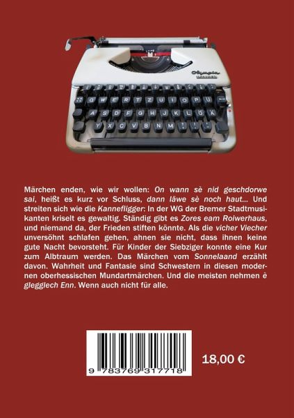 Märchen enden, wie wir wollen: On wann sè nid geschdorwe sai, heißt es kurz vor Schluss, dann läwe sè noch haut. Und streiten sich wie die Kannefligger: In der WG der Bremer Stadtmusi- kanten kriselt es gewaltig. Ständig gibt es Zores eam Roiwerhaus, und niemand da, der Frieden stiften könnte. Als die vicher Viecher unversöhnt schlafen gehen, ahnen sie nicht, dass ihnen keine gute Nacht bevorsteht. Für Kinder der Siebziger konnte eine Kur zum Albtraum werden. Das Märchen vom Sonnelaand erzählt davon. Wahrheit und Fantasie sind Schwestern in diesen moder- nen oberhessischen Mundartmärchen. Und die meisten nehmen è glegglech Enn. Wenn auch nicht für alle.