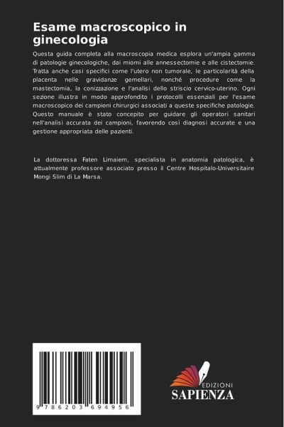 Questa guida completa alla macroscopia medica esplora un'ampia gamma di patologie ginecologiche, dai miomi alle annessectomie e alle cistectomie. Tratta anche casi specifici come l'utero non tumorale, le particolarità della placenta nelle gravidanze gemellari, nonché procedure come la mastectomia, la conizzazione e l'analisi dello striscio cervico-uterino. Ogni sezione illustra in modo approfondito i protocolli essenziali per l'esame macroscopico dei campioni chirurgici associati a queste specifiche patologie. Questo manuale è stato concepito per guidare gli operatori sanitari nell'analisi accurata dei campioni, favorendo così diagnosi accurate e una gestione appropriata delle pazienti.