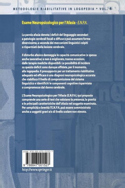 La parola afasia denota i deficit del linguaggio secondari a patologie cerebrali focali e diffuse e può assumere forme diversissime, a seconda dei meccanismi linguistici colpiti o risparmiati dalla lesione cerebrale. Il disturbo afasico danneggia le capacità comunicative (e spesso anche lavorative) e non è migliorato, tranne eccezioni, dalle terapie mediche disponibili. Le possibilità di incidere su questo deficit sono dunque affidate, per il momento, alla logopedia. Il presupposto per un trattamento riabilitativo adeguato ed efficace è una diagnosi neuropsicologica accurata che stabilisca il livello di compromissione del sistema linguistico e identifichi le componenti cognitive risparmiate o compromesse dal danno cerebrale. L'esame neuropsicologico dell'afasia (E.N.P.A.) qui proposto comprende una serie di test che valutano la presenza, la gravità e le principali caratteristiche dell'afasia nel soggetto esaminato. Per semplicità e brevità l'E.N.P.A. può essere somministrato anche a soggetti gravi e/o di livello scolare non elevato.