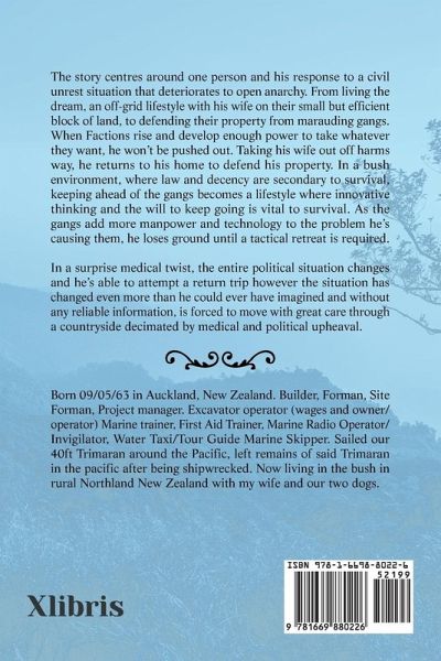 The story centres around one person and his response to a civil unrest situation that deteriorates to open anarchy. From living the dream, an off-grid lifestyle with his wife on their small but efficient block of land, to defending their property from marauding gangs. When Factions rise and develop enough power to take whatever they want, he won't be pushed out. Taking his wife out off harms way, he returns to his home to defend his property. In a bush environment, where law and decency are secondary to survival, keeping ahead of the gangs becomes a lifestyle where innovative thinking and the will to keep going is vital to survival. As the gangs add more manpower and technology to the problem he's causing them, he loses ground until a tactical retreat is required. In a surprise medical twist, the entire political situation changes and he's able to attempt a return trip however the situation has changed even more than he could ever have imagined and without any reliable information, is forced to move with great care through a countryside decimated by medical and political upheaval.