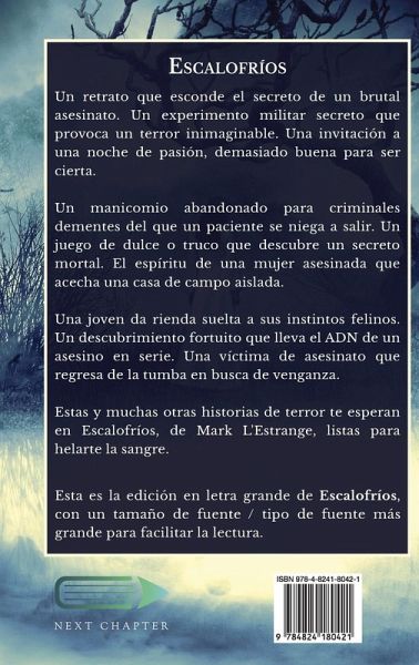 Un retrato que esconde el secreto de un brutal asesinato. Un experimento militar secreto que provoca un terror inimaginable. Una invitación a una noche de pasión, demasiado buena para ser cierta. Un manicomio abandonado para criminales dementes del que un paciente se niega a salir. Un juego de dulce o truco que descubre un secreto mortal. El espíritu de una mujer asesinada que acecha una casa de campo aislada. Una joven da rienda suelta a sus instintos felinos. Un descubrimiento fortuito que lleva el ADN de un asesino en serie. Una víctima de asesinato que regresa de la tumba en busca de venganza. Estas y muchas otras historias de terror te esperan en Escalofríos, de Mark L'Estrange, listas para helarte la sangre. Esta es la edición en letra grande de Escalofríos, con un tamaño de fuente / tipo de fuente más grande para facilitar la lectura.