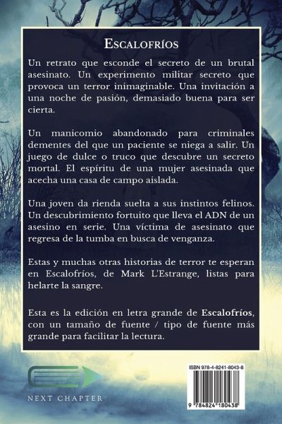 Un retrato que esconde el secreto de un brutal asesinato. Un experimento militar secreto que provoca un terror inimaginable. Una invitación a una noche de pasión, demasiado buena para ser cierta. Un manicomio abandonado para criminales dementes del que un paciente se niega a salir. Un juego de dulce o truco que descubre un secreto mortal. El espíritu de una mujer asesinada que acecha una casa de campo aislada. Una joven da rienda suelta a sus instintos felinos. Un descubrimiento fortuito que lleva el ADN de un asesino en serie. Una víctima de asesinato que regresa de la tumba en busca de venganza. Estas y muchas otras historias de terror te esperan en Escalofríos, de Mark L'Estrange, listas para helarte la sangre. Esta es la edición en letra grande de Escalofríos, con un tamaño de fuente / tipo de fuente más grande para facilitar la lectura.