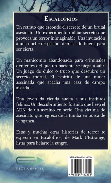 Un retrato que esconde el secreto de un brutal asesinato. Un experimento militar secreto que provoca un terror inimaginable. Una invitación a una noche de pasión, demasiado buena para ser cierta. Un manicomio abandonado para criminales dementes del que un paciente se niega a salir. Un juego de dulce o truco que descubre un secreto mortal. El espíritu de una mujer asesinada que acecha una casa de campo aislada. Una joven da rienda suelta a sus instintos felinos. Un descubrimiento fortuito que lleva el ADN de un asesino en serie. Una víctima de asesinato que regresa de la tumba en busca de venganza. Estas y muchas otras historias de terror te esperan en Escalofríos, de Mark L'Estrange, listas para helarte la sangre.