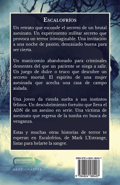 Un retrato que esconde el secreto de un brutal asesinato. Un experimento militar secreto que provoca un terror inimaginable. Una invitación a una noche de pasión, demasiado buena para ser cierta. Un manicomio abandonado para criminales dementes del que un paciente se niega a salir. Un juego de dulce o truco que descubre un secreto mortal. El espíritu de una mujer asesinada que acecha una casa de campo aislada. Una joven da rienda suelta a sus instintos felinos. Un descubrimiento fortuito que lleva el ADN de un asesino en serie. Una víctima de asesinato que regresa de la tumba en busca de venganza. Estas y muchas otras historias de terror te esperan en Escalofríos, de Mark L'Estrange, listas para helarte la sangre.