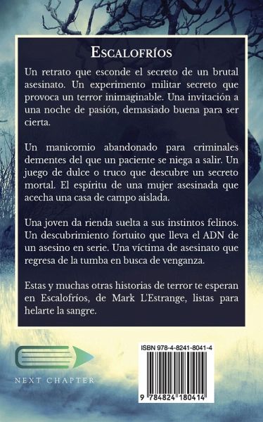 Un retrato que esconde el secreto de un brutal asesinato. Un experimento militar secreto que provoca un terror inimaginable. Una invitación a una noche de pasión, demasiado buena para ser cierta. Un manicomio abandonado para criminales dementes del que un paciente se niega a salir. Un juego de dulce o truco que descubre un secreto mortal. El espíritu de una mujer asesinada que acecha una casa de campo aislada. Una joven da rienda suelta a sus instintos felinos. Un descubrimiento fortuito que lleva el ADN de un asesino en serie. Una víctima de asesinato que regresa de la tumba en busca de venganza. Estas y muchas otras historias de terror te esperan en Escalofríos, de Mark L'Estrange, listas para helarte la sangre.