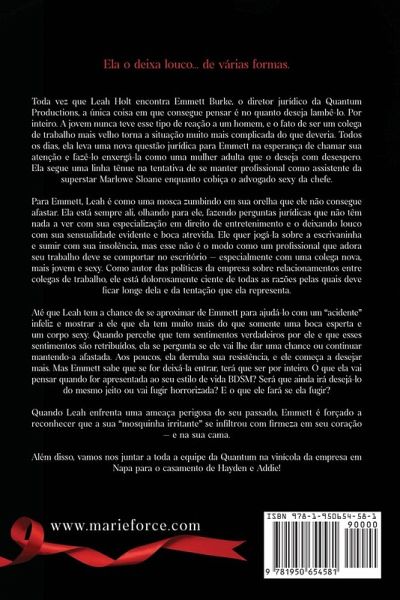 Ela o deixa louco... de várias formas. Toda vez que Leah Holt encontra Emmett Burke, o diretor jurídico da Quantum Productions, a única coisa em que consegue pensar é no quanto deseja lambê-lo. Por inteiro. A jovem nunca teve esse tipo de reação a um homem, e o fato de ser um colega de trabalho mais velho torna a situação muito mais complicada do que deveria. Todos os dias, ela leva uma nova questão jurídica para Emmett na esperança de chamar sua atenção e fazê-lo enxergá-la como uma mulher adulta que o deseja com desespero. Ela segue uma linha tênue na tentativa de se manter profissional como assistente da superstar Marlowe Sloane enquanto cobiça o advogado sexy da chefe. Para Emmett, Leah é como uma mosca zumbindo em sua orelha que ele não consegue afastar. Ela está sempre ali, olhando para ele, fazendo perguntas jurídicas que não têm nada a ver com sua especialização em direito de entretenimento e o deixando louco com sua sensualidade evidente e boca atrevida. Ele quer jogá-la sobre a escrivaninha e sumir com sua insolência, mas esse não é o modo como um profissional que adora seu trabalho deve se comportar no escritório — especialmente com uma colega nova, mais jovem e sexy. Como autor das políticas da empresa sobre relacionamentos entre colegas de trabalho, ele está dolorosamente ciente de todas as razões pelas quais deve ficar longe dela e da tentação que ela representa. Até que Leah tem a chance de se aproximar de Emmett para ajudá-lo com um "acidente" infeliz e mostrar a ele que ela tem muito mais do que somente uma boca esperta e um corpo sexy. Quando percebe que tem sentimentos verdadeiros por ele e que esses sentimentos são retribuídos, ela se pergunta se ele vai lhe dar uma chance ou continuar mantendo-a afastada. Aos poucos, ela derruba sua resistência, e ele começa a desejar mais. Mas Emmett sabe que se for deixá-la entrar, terá que ser por inteiro. O que ela vai pensar quando for apresentada ao seu estilo de vida BDSM? Será que ainda irá desejá-lo do mesmo jeito ou vai fugir horrorizada? E o que ele fará se ela fugir? Quando Leah enfrenta uma ameaça perigosa do seu passado, Emmett é forçado a reconhecer que a sua "mosquinha irritante" se infiltrou com firmeza em seu coração — e na sua cama. Além disso, vamos nos juntar a toda a equipe da Quantum na vinícola da empresa em Napa para o casamento de Hayden e Addie!