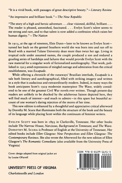 In 1913, at the age of nineteen, Elsie Dunn--later to be known as Evelyn Scott--turned her back on the genteel Southern world she was born into and ran off to Brazil with a married Tulane University dean more than twice her age. Living in tropical exile under assumed names, the couple produced a son and endured a grueling series of hardships and failures that would provide Scott with the raw material for Escapade, first published in 1923 amid expressions of mingled outrage and admiration from the critical establishment. Scott went on to write the 1929 modernist masterpiece The Wave, widely considered to be one of the greatest Civil War novels ever written.