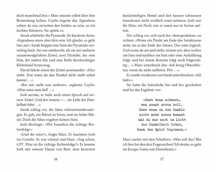 Es sollte der krönende Abschluss einer Politik-Projektwoche sein: Sechs Schülerinnen und Schüler der achten Klasse, ein Escape Game zum Thema Demokratie und fünf Stunden Zeit, das Spiel zu gewinnen. Doch das Spiel verlangt nicht nur Wissen und Geschick von den Jugendlichen, sondern sie werden selbst Teil des Experiments, indem ihre tiefsten Überzeugungen auf die Probe gestellt werden. Nach und nach gewinnen Missgunst, Rivalität und Machtmissbrauch die Oberhand. Als auch noch private Konflikte hochkochen, steht die Gruppe an einem Scheidepunkt: Schaffen sie es, sich auf ihr gemeinsames Ziel zu besinnen, bevor die Situation völlig aus dem Ruder läuft?