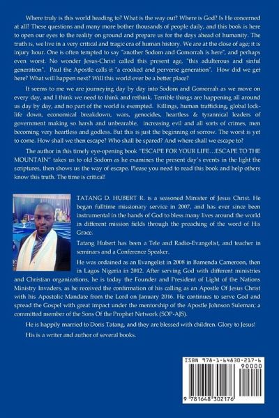Where truly is this world heading to? What is the way out? Where is God? Is He concerned at all? These questions and many more bother thousands of people daily, and this book is here to open our eyes to the reality on ground and prepare us for the days ahead of humanity. The truth is, we live in a very critical and tragic era of human history. We are at the close of age; it is injury hour. One is often tempted to say "another Sodom and Gomorrah is here", and perhaps even worst. No wonder Jesus-Christ called this present age, "this adulterous and sinful generation". Paul the Apostle calls it "a crooked and perverse generation". How did we get here? What will happen next? Will this world ever be a better place? It seems to me we are journeying day by day into Sodom and Gomorrah as we move on every day, and I think we need to think and rethink. Terrible things are happening all around us day by day, and no part of the world is exempted. Killings, human trafficking, global lock-life down, economical breakdown, wars, genocides, heartless & tyrannical leaders of government making so harsh and unbearable, increasing evil and all sorts of crimes, men becoming very heartless and godless. But this is just the beginning of sorrow. The worst is yet to come. How shall we then escape? Who shall be spared? And where shall we escape to? The author in this timely eye-opening book "ESCAPE FOR YOUR LIFE...ESCAPE TO THE MOUNTAIN" takes us to old Sodom as he examines the present day's events in the light the scriptures, then shows us the way of escape. Please you need to read this book and help others know this truth. The time is critical!
