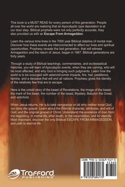 Through a study of Biblical teachings, commentaries, and ecclesiastical histories, you will learn exactly what Apocalyptic events are coming on the earth, when they are coming, why God is bringing such judgments, who will be most affected, and what escape has been provided by God. Learn about the 7000 year dateline of mortal man. The first 2000 years was the Patriarchal Age (Adam to Abraham). Next, was the 2000 year Time of Israel. The next 2000 years was the Time of Gentiles. The last 1000 years will see Jesus return to the house of Israel, gather them from heaven and earth, and establish them as His people for the thousand year Sabbath of Creation and eternity. Heaven will be here on earth; with a New Jerusalem in North America and with Jerusalem as the cities of God and Jesus. The Bible teaches all of the Apocalyptic events will occur by 2007. Man cannot begin to imagine the horror of these events. They will make the Great Flood seem like a brief shower. Only a third of the house of Israel is to survive. Gentiles will be, "as though they had not been." The world is to be scourged with asteroid/comet impacts, fire, hail, pestilence, famine, and a decease that will end all nations. Death will be more common than life. Only a relatively few will survive. Here is the untold story of why God stopped speaking to man in 99 AD; and when He was to speak again. The Bible tells how a beast (kingdom) destroyed the Church of Christ, divine authority, and finally every saint of God on the earth. Learn how Constantine, in 325 AD, amalgamated pagan Rome with Christianity; and created this beast of Revelations that was to rule supreme over the souls of man for 1260 years. Discover how the Bible provides the true story of this beast, the image of the beast, the mark of the beast, and antiChrist. There was to be a brief restoration of divine authority in the last days; and then only a very small remnant would remain to offer escape. When Jesus returns, He is to destroy those who do not know God and do not obey the gospel. This book reveals the true character, attributes, and will of God. Here is the true identity of Jesus Christ. Learn of the original gospel of Christ. The relationship between God and His people is traced from Adam to the end of mortal man. Most important, here is the only Biblical escape from Armageddon; and path to eternal life.
