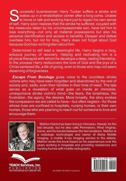 Successful businessman Harry Tucker suffers a stroke and wakes up in a rehabilitation center after a long coma. Unable to move or talk and working hard just to regain his own sense of self, Harry soon realizes that the stroke he suffered, coupled with the measures taken by his uncompassionate son, have led him to lose everything-not only all material possessions but also his personal identification and access to benefits. Despair and defeat overtake him, but not for long. Harry does not forget about God because God has not forgotten about him. Determined to still lead a meaningful life, Harry begins a long, arduous journey of recovery. Helping and motivating him is a physical therapist with whom he develops a deep, lasting friendship. In the process Harry rediscovers the love of God and the joys of a Christ-centered life, a life of giving, even to those who may not seem deserving of forgiveness. Escape From Bondage gives voice to the countless stroke victims who may have been forgotten and abandoned by the rest of society and, sadly, even their families in their time of need. The tale serves as a revelation of what goes on inside an immobile, unresponsive stroke victim's mind-the fears, the loneliness, the frustration, the agony, the desires. More broadly, the story evokes the compassion we are called to have-but often neglect-for those whose lives are confined to hospitals, nursing homes, or their own homes, those who are yearning to reach out for someone to love and encourage them.