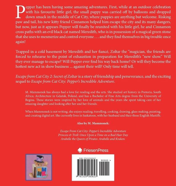 Pepper has been having some amazing adventures. First, while at an outdoor celebration with his favourite little girl, the small puppy was carried off by balloons and dropped down smack in the middle of Cat City, where puppies are anything but welcome. Risking paw and tail, his new kitty friend Cinnamon helped him escape the city and its many dangers, but now, just as it appears Pepper will finally be reunited with his little girl, he and Cinnamon cross paths with an evil black cat named Meredith, who is in possession of a magical green stone that she uses to mesmerize and control everyone . . . and they find themselves in big trouble once again! Trapped in a cold basement by Meredith and her fiancé, Zoltar the "magician, the friends are forced to rehearse to the point of exhaustion in preparation for Meredith's "new show." Will they ever manage to escape? Will Pepper ever find his way back home? Or will they become the hottest new act in show business ... against their will? Only time will tell. Escape from Cat City 2: Secret of Zoltar is a story of friendship and perseverance, and the exciting sequel to Escape from Cat City: Pepper's Incredible Adventure.