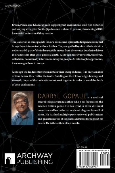Jirboa, Pleen, and Khadaran each support great civilizations, with rich histories and varying strengths. But the Jipadara sun is about to go nova, threatening all life forms with extinction if they remain. The leaders of all three planets follow a cosmic and spiritually designed destiny that brings them into contact with each other. They are guided by a force that exists in a nether world, part of the indestructible matter from the creator but derived from their ancestors after their physical death. Although mostly invisible, this force, called Zen, occasionally intervenes among the people. As catastrophe approaches, it encourages them to escape. Although the leaders strive to maintain their independence, it is only a matter of time before they realize the truth. Building on their knowledge, history, and strength, they and their scientists must work together in order to avoid the death of their civilizations.