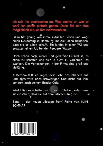 Ich sah ihn erschrocken an. Was dachte er, wer er war? Ich sollte einfach gehen. Dann fiel mir eine Möglichkeit ein, es ihm heimzuzahlen. Lilian hat genug von ihrem aktuellen Leben und wagt einen Neuanfang in Hamburg. Ihr Ziel: allen beweisen, dass sie es allein schafft. Sie landet in einer WG und ergattert einen Job bei der Reederei Watson. Doch schon nach kurzer Zeit gerät ihr Entschluss, es allein zu schaffen und sich ja nicht zu verlieben, ins Wanken. Die Verlockungen in der Firma sind groß und vielfältig. Außerdem fällt sie James, dem Sohn des Inhabers auf, und alles wird noch schwieriger. Und nicht nur ihm, sondern auch seinem Bruder Cole. Wird Lilian es schaffen, sich treu zu bleiben, oder muss sie einsehen, dass sie auf dem falschen Weg ist? Band 1 der "Escape from"-Reihe von K.I.M. SOMMAR