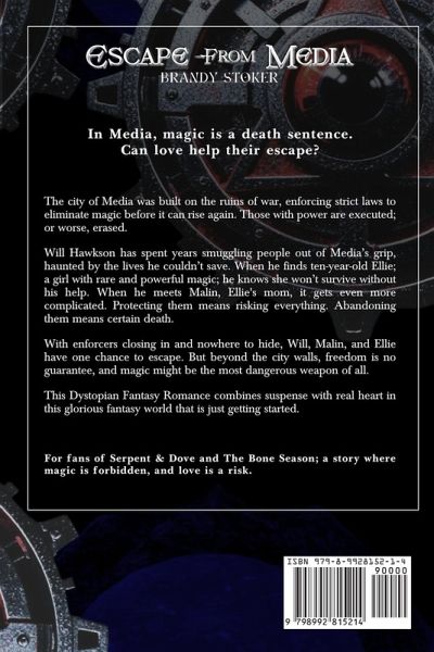 In Media, magic is a death sentence. Can love help their escape? A dystopian fantasy romance perfect for fans of Shatter Me, Red Queen, and The Hunger Games. In the city of Media, magic is outlawed and enforced with deadly precision. The walls are high, the rules are absolute, and freedom is just a distant dream whispered in back alleys. But not everyone is willing to obey. When Will Hawkson, a rogue smuggler haunted by loss, sees eleven-year-old Ellie Neldoreth using magic, he knows that if she is found, she could die, just like his sister. When he meets her mother, Malin, a doctor, who did not realize her daughter's gifts and whom Will helps to unlock her own, he knows he must help them escape the city before they are both found. Malin must give up everything to help her daughter have the life she deserves. With twists and turns, time running out, and chased by enforcers who will stop at nothing to destroy what they fear, they must make their escape. Their paths collide in a journey that tests their loyalty, strength, and the limits of love. With vivid world-building, emotionally rich characters, and a slow-burn romance woven through edge-of-your-seat action, Escape to Media blends the dystopian danger of An Ember in the Ashes with the raw vulnerability of found family and forbidden powers. This is Book One in the Aloria/Media series. ¿¿¿¿ Bonus content available: Liberators of Media (free prequel) + exclusive maps and character extras for newsletter subscribers. ¿¿¿¿ Learn more at www.brandystoker.com This series is perfect for readers who enjoy:Dystopian fantasy with romance and rebellion Complex characters, moral ambiguity, and emotional stakes Found family and protector dynamics Magical systems suppressed by authoritarian rule Enemies-to-allies relationships and slow-burn tension Series like Legend, Divergent, and Throne of Glass Spicy Romance Content Warning: This story contains themes of violence, war, emotional trauma, child endangerment, authoritarian control, and romantic intimacy. Scenes may include battle sequences, injuries, references to loss and grief, and sensual content between consenting adults. Reader discretion is advised. Recommended for readers 18 and over. Book Two, Journey to Aloria, will be released in November 2025. Audiobooks narrated by Laura Horowitz begin in December 2025. Includes themes of: