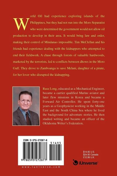 World Oil had experience exploring islands of the Philippines, but they had not run into the Moro Separatist who were determined to government would not allow oil production to develop in their area. It would bring law and order, making their control of Mindanao impossible. Tim McClellan and his friends had experience dealing with the kidnappers who attempted to end their fieldwork. A chase through forest of valuable hardwoods, marketed by the terrorists, led to conflicts between dhows in the Moro Gulf. They drove to Zamboanga to save Melani, daughter of a pirate, for her lover who disrupted the kidnapping.