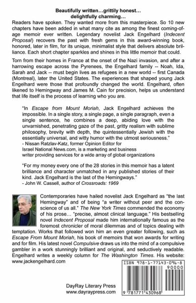 Beautifully written...grittily honest...delightfully charming... Readers have spoken. They wanted more from this masterpiece. So 10 new chapters have been added in what many cite as among the finest coming-of-age memoir ever written. Legendary novelist Jack Engelhard (Indecent Proposal) recovers the past with fresh gems in this award-winning book, honored, later in film, for its unique, minimalist style that delivers absolute brilliance. Each short chapter sparkles and shines in this little memoir that could. Torn from their homes in France at the onset of the Nazi invasion, and after a harrowing escape across the Pyrenees, the Engelhard family -- Noah, Ida, Sarah and Jack -- must begin lives as refugees in a new world -- first Canada (Montreal), later the United States. The experiences that shaped young Jack Engelhard were those that profoundly changed the world. Engelhard, often likened to Hemingway and James M. Cain for precision, helps us understand that life itself is the process of learning who you are. Reviews: "In Escape from Mount Moriah, Jack Engelhard achieves the impossible. In a single story, a single page, a single paragraph, even a single sentence, he combines a deep, abiding love with the unvarnished, penetrating gaze of the past, gritty realism with sublime philosophy, brevity with depth, the quintessentially Jewish with the essentially universal, and witty humor with the utmost seriousness." - Nissan Ratzlav Katz, former Opinion Editor for Israel National News.com "For my money every one of the 28 stories in this memoir has a latent brilliance and character unmatched in any published stories of their kind. Jack Engelhard is the last of the Hemingways." - John W. Cassell, author of Crossroads: 1969 "The refugee stories Engelhard preserves are boyhood memories of an almost Tom Sawyer character... adventurous, humorous, sometimes wonderfully strange exploits of a youth during his family's adjustment to a new world." - Chris Leppek, Jewish News (Denver) "This book is a winner within its own niche of brilliance...to the child in us, living eternally. Engelhard's balsamic bible of a book." - Linda Shelnutt About the Author: Contemporaries have hailed novelist Jack Engelhard as "the last Hemingway" and of being "a writer without peer and the conscience of us all." The New York Times commended the economy of his prose... "precise, almost clinical language." His bestselling novel Indecent Proposal made him internationally famous as the foremost chronicler of moral dilemmas and of topics dealing with temptation. Works that followed won him an even greater following, such as Escape from Mount Moriah, his book of memoirs that won awards for writing and for film. His latest novel Compulsive draws us into the mind of a compulsive gambler in a work stunningly brilliant and original, and seductively readable. Engelhard writes a weekly column for The Washington Times. His website: www.jackengelhard.com