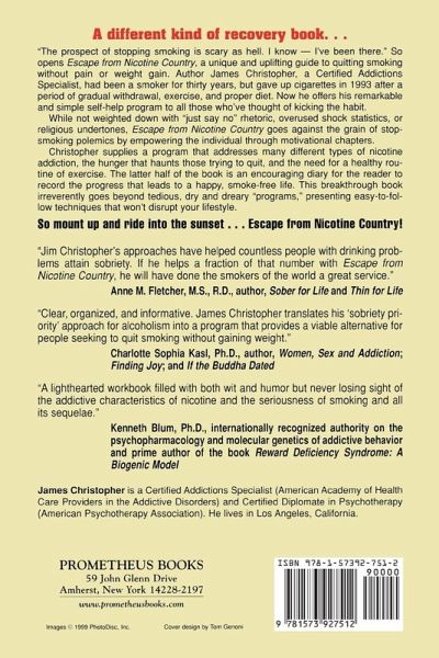 "The prospect of stopping smoking is scary as hell. I know-I've been there." So opens Escape from Nicotine Country, James Christopher's unique and uplifting guide to quitting smoking without pain or weight gain. A thirty-year smoker, Christopher gave up cigarettes in 1993, after a gradual period of individual withdrawal, exercise, and proper diet. Now he offers his remarkable and simple self-help program to all those who want to kick the habit. While not weighed down with "just say no" rhetoric, overused shock statistics, or religious undertones, Escape from Nicotine Country goes against the grain of stop-smoking polemics by empowering the individual through motivational chapters. Christopher tells his own story of addiction and success in quitting. At the same time he promotes understanding of nicotine addiction and offers a simple solution to breaking the habit through reduction. Christopher's program addresses many different types of nicotine addiction, the hunger that haunts those trying to quit, and the need for a healthy routine of exercise. The latter half of the book is an encouraging diary, which allows the reader to record the progress that will lead to a healthier, smoke-free life.