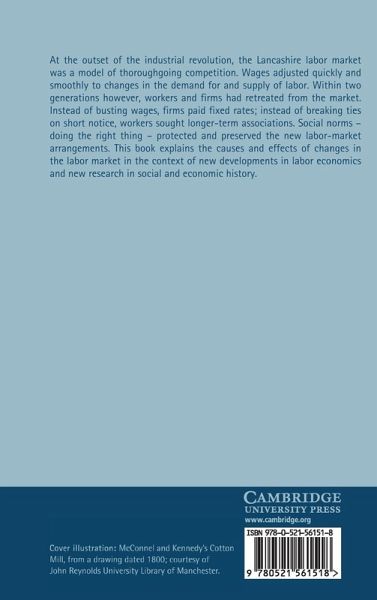 At the outset of the industrial revolution the Lancashire labour market was a model of thoroughgoing competition. Wages adjusted quickly and smoothly to changes in the demand for and supply of labour. Within two generations, however, workers and firms had retreated from the market. Instead of busting wages, firms paid fixed rates; instead of breaking ties on short notice, workers sought longer-term associations. Social norms - doing the right thing - protected and preserved the fresh labour market arrangements. This book explains the causes and effects of changes in the labour market in the context of developments in labour economics and fresh research in social and economic history.