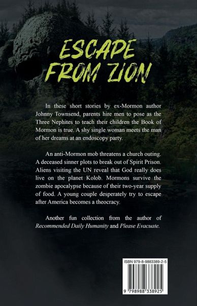 In these short stories by ex-Mormon author Johnny Townsend, parents hire men to pose as the Three Nephites to teach their children the Book of Mormon is true. A shy single woman meets the man of her dreams at an endoscopy party.An anti-Mormon mob threatens a church outing. A deceased sinner plots to break out of Spirit Prison. Aliens visiting the UN reveal that God really does live on the planet Kolob. Mormons survive the zombie apocalypse because of their two-year supply of food. A young couple desperately try to escape after America becomes a theocracy.Another fun collection from the author of Recommended Daily Humanity and Please Evacuate.