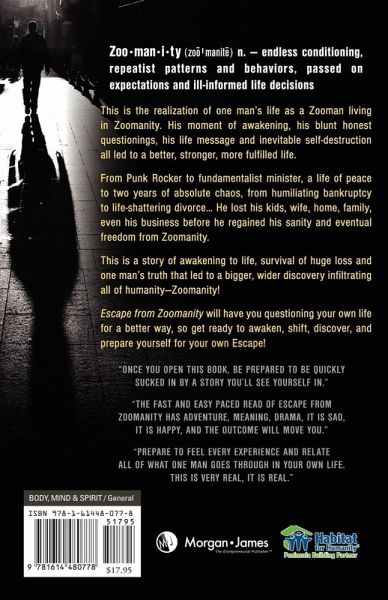 This is the realization of one man's life as a Zooman living in Zoomanity. His moment of awakening, his blunt honest questionings, his life messages and inevitable self-destruction all lead to a better, stronger, more fulfilled life. From Punk Rocker to fundamentalist minister, a life of peace to two years of absolute chaos, from humiliating bankruptcy to life shattering divorce...He lost his kids, wife, home, family,even his business before he regained his sanity and eventual freedom from Zoomanity. This is a story of awakening to life, survival of huge loss and one man’s truth that led to a bigger, wider discovery infiltrating all of humanity - Zoomanity! Escape from Zoomanity will have you questioning your own life for a better way, so get ready to awaken, shift, discover, and prepare yourself for your own Escape!