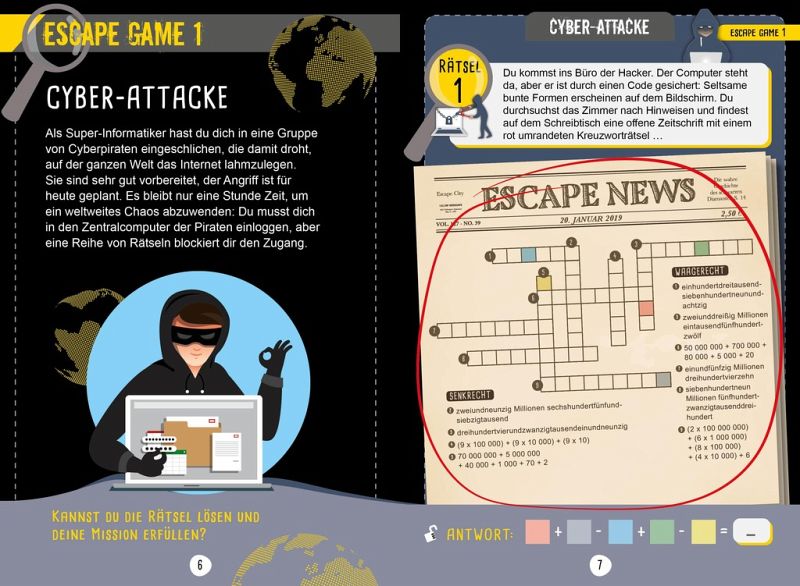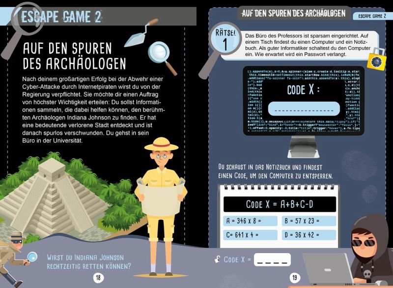 Spannende Szenarien und Escape-Rooms für clevere Detektive! Knifflige Rätsel für kleine Genies! Zahlreiche Geheimnisse, tückische Fallen und verschlüsselte Alphabete müssen gelöst werden, um die 8 Szenarien lösen zu können. Dabei müssen die kleinen Detektive ein Gespür für Logik und eine schnelle Beobachtungsgabe entwickeln, um kryptische Nachrichten zu entschlüsseln und damit entfliehen zu können. Ganz nebenbei können die Kinder auch spielerisch ihre ersten Mathekenntnisse wiederholen und vertiefen. Ein fesselndes Escape-Game in Buchform!
