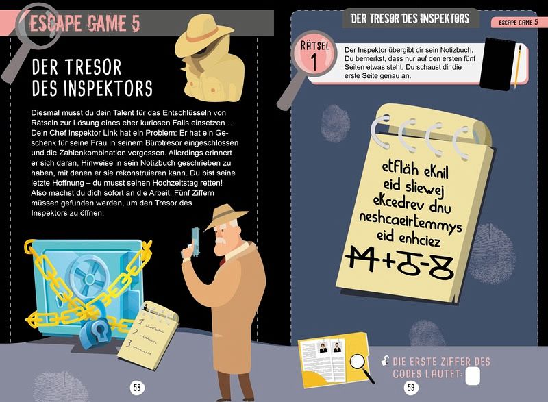 Spannende Szenarien und Escape-Rooms für clevere Detektive! Knifflige Rätsel für kleine Genies! Zahlreiche Geheimnisse, tückische Fallen und verschlüsselte Alphabete müssen gelöst werden, um die 10 Szenarien lösen zu können. Dabei müssen die Detektive ein Gespür für Logik und eine schnelle Beobachtungsgabe entwickeln, um kryptische Nachrichten zu entschlüsseln und damit entfliehen zu können. Ganz nebenbei kann man so auch spielerisch seine Mathekenntnisse wiederholen und vertiefen. Ein fesselndes Escape-Game in Buchform!