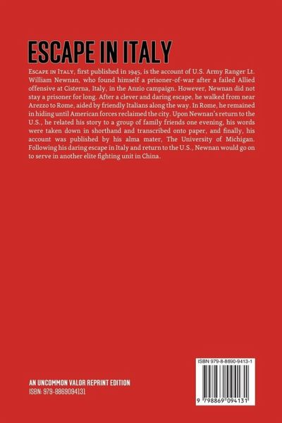 Escape in Italy, first published in 1945, is the account of U.S. Army Ranger Lt. William Newnan, who found himself a prisoner-of-war after a failed Allied offensive at Cisterna, Italy, in the Anzio campaign. However, Newnan did not stay a prisoner for long. After a clever and daring escape, he walked from near Arezzo to Rome, aided by friendly Italians along the way. In Rome, he remained in hiding until American forces reclaimed the city. Upon Newnan's return to the U.S., he related his story to a group of family friends one evening, his words were taken down in shorthand and transcribed onto paper, and finally, his account was published by his alma mater, The University of Michigan. Following his daring escape in Italy and return to the U.S., Newnan would go on to serve in another elite fighting unit in China.