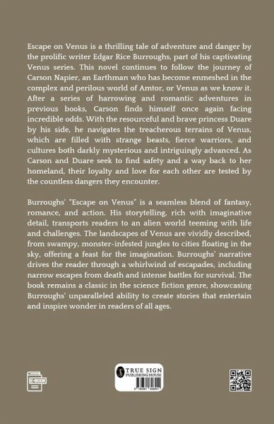 ""Escape on Venus"" is an exhilarating science fiction novel by Edgar Rice Burroughs, celebrated for its imaginative storytelling and captivating world-building. Set on the planet Venus, the story follows the adventures of Carson Napier, a daring Earthman who finds himself stranded on the mysterious and perilous world. As Carson explores the exotic landscapes and encounters strange creatures, he becomes embroiled in a series of thrilling escapades, including battles with hostile aliens, daring rescues, and quests for hidden treasures. Along the way, Carson forms alliances with both human and alien allies, including the beautiful Duare and the noble Taman. With its blend of action, romance, and adventure, ""Escape on Venus"" transports readers to a realm of wonder and excitement, where the spirit of exploration knows no bounds and the possibilities are endless. Burroughs' vivid imagination and dynamic storytelling make ""Escape on Venus"" a timeless classic in the genre of science fiction literature.