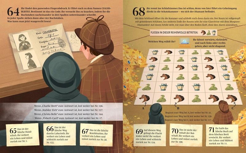 Vom Spielprinzip her ähnelt das Escape-Buch Entscheidungsabenteuern, nur dass man hier vorher ein Rätsel lösen muss, um die nächste, hoffentlich richtige Zahl zu erfahren und beim entsprechenden Eintrag mit der Ermittlung fortzufahren. Manchmal sind es Bilderrätsel, es gibt aber auch Fragen, die eher auf das Allgemeinwissen abzielen. Manchmal muss man an bestimmten Merkmalen unter einer Vielzahl von Gegenständen oder Personen den/die richtige/n finden, Labyrinthe durchqueren, Wege finden, Puzzleteile zusammensetzen, Muster erkennen, Rechenaufgaben lösen, Schatten zuordnen, sehr häufig Codes mit den am Anfang des Buches erwähnten Dechiffrierungen knacken und vieles mehr. Zuvor liest man immer einen weiteren Teil der Geschichte. Die einzelnen Textteile wirken gering, nimmt man sich das ganze Buch vor, kommt allerdings einiges an Text zusammen. Meine 9-jährige Tochter und ich haben gemeinsam gerätselt, so dass wir uns das Lesen aufteilen konnten und wir auch recht flott beim Lösen der Rätsel waren. Zu zweit - ich hab versucht nicht zu viel zu helfen, aber doch einige Male Hinweise gegeben - haben wir all die kniffligen Aufgaben fehlerfrei gelöst und es knapp in der größten Schwierigkeitsstufe geschafft, Moriarty den Diamanten wieder abzuluchsen. Alleine glaube ich, wäre das Abenteuer an einem Stück zu viel gewesen, doch Pausen sind jederzeit möglich. Auch, wenn man ein Rätsel mal nicht lösen kann, ist das noch kein Beinbruch, man sollte sich nur beim Weiterblättern die vorherige Zahl merken, damit man notfalls wieder zurück kann.