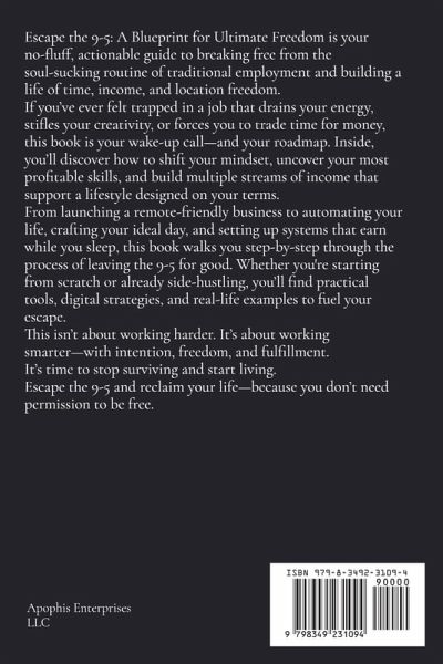 Escape the 9-5: A Blueprint for Ultimate Freedom is your no-fluff, actionable guide to breaking free from the soul-sucking routine of traditional employment and building a life of time, income, and location freedom. If you've ever felt trapped in a job that drains your energy, stifles your creativity, or forces you to trade time for money, this book is your wake-up call-and your roadmap. Inside, you'll discover how to shift your mindset, uncover your most profitable skills, and build multiple streams of income that support a lifestyle designed on your terms. From launching a remote-friendly business to automating your life, crafting your ideal day, and setting up systems that earn while you sleep, this book walks you step-by-step through the process of leaving the 9-5 for good. Whether you're starting from scratch or already side-hustling, you'll find practical tools, digital strategies, and real-life examples to fuel your escape. This isn't about working harder. It's about working smarter-with intention, freedom, and fulfillment. It's time to stop surviving and start living. Escape the 9-5 and reclaim your life-because you don't need permission to be free.